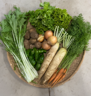 里芋、玉ねぎ、ピーマン、大根、人参菜、レタス、水菜