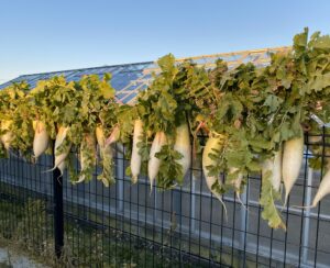 たくあん用の大根を束ねて縛り、天日干しをしています。