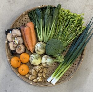 菊芋、新玉ねぎ、ブロッコリー、葉ネギ、菜花、小松菜、人参、原木椎茸、みかんの組み合わせになりました。